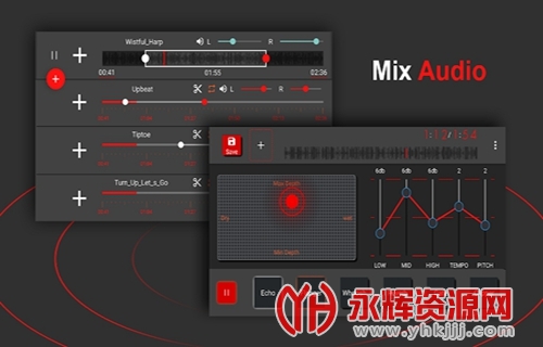 音频混合:混合四音频, 更改节奏 (速度)/间距, 有所有 dj 效果选项和过滤器