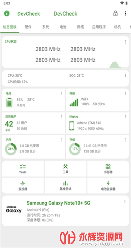 1、信息面板显示cpu状态、cpu负载、电池状态、网络情况(包括上传下载速度),运行内存大小,手机存储空间大小。
