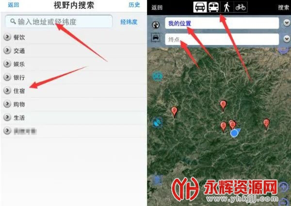 1、搜索,快速搜索附近餐饮、交通和银行等等,也可手动输入搜索并确认搜索位置;