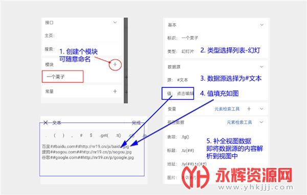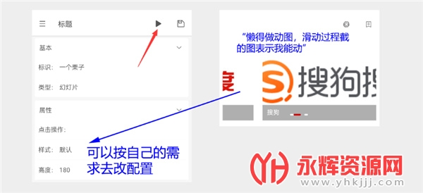 理论不如实践,以幻灯片模块为例,如图: 若未搞过轻站的小同学请务必创建一个新的窗口来创建一个轻站完成以下图中操作。跟着操作一篇,基本上轻站也就会写啦!