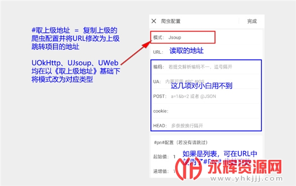 如上图所示,不管你数据源操作的是什么类型,最总目的都是去获取一个文本最后交由页面渲染器进行解析并将界面渲染出来。对了,数据源中的 #爬虫 实际上和爬虫并无多大的关系但也有一定的关系。 爬虫的配置图解: