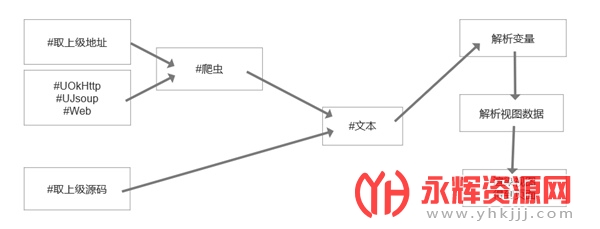 数据源就是视图的源内容,可以利用 #爬虫 去获取网络或本地的文本内容,比如API、网页等等,也可以像上面栗子一样直接放 #文本 去放一个固定的文本内容。唔,先看一下轻站的运行流程图: