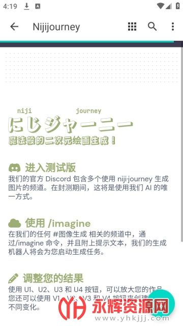 Nijijourney图生图是一款近期在抖音各大平台非常热门的ai人工智能绘画软件,软件内有超多的小配件等绘画素材,所有的材料都是免费的,还能够通过文字描述,确定喜欢的绘图风格,生成各种美丽的画作,操作十分简单,还有超多的关键词,可以让你在任何时候都可以体验到不一样的线上绘画,新的功能也会不断地进行更新,这是一个方便又方便的手机绘画平台。喜欢的欢迎来永辉资源下载吧!