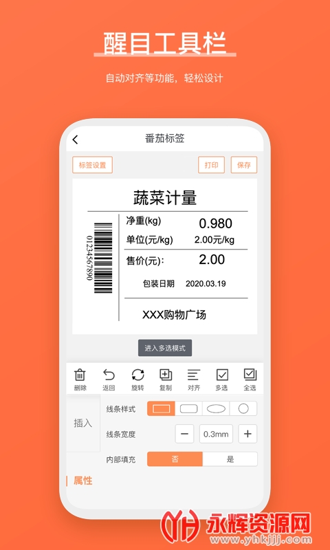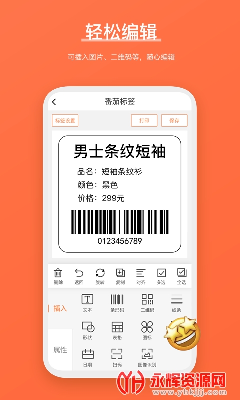1、 编辑条码:界面清晰,可轻松设计任何形式的条码,支持插入条形码、二维码、线条、矩形、图像等;可一键设置不同的对齐方式。