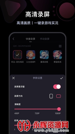 1、快捷录屏,主流游戏,一键唤起录屏~支持1080P录制,多档码率、帧率可调