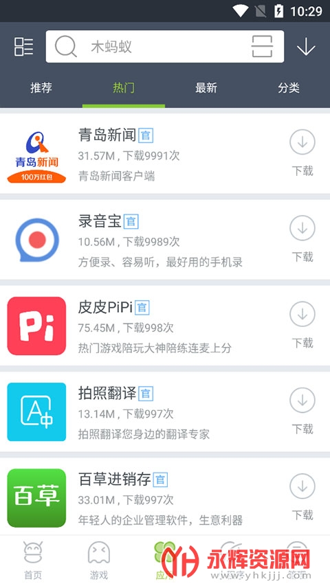 木蚂蚁应用市场是一款专为安卓手机用户打造的优质应用游戏下载平台,拥有十万款经过第三方安全检测的Android应用,游戏分类明确,用户可以轻松找到新发布的国内外应用及游戏,并在关注平台后第一时间获得新游戏发布详情的通知。该软件内容全,下载快,汉化多,在界面和操作上充分考虑国人使用习惯,并提供海量国内外各类热门应用和游戏免费下载。