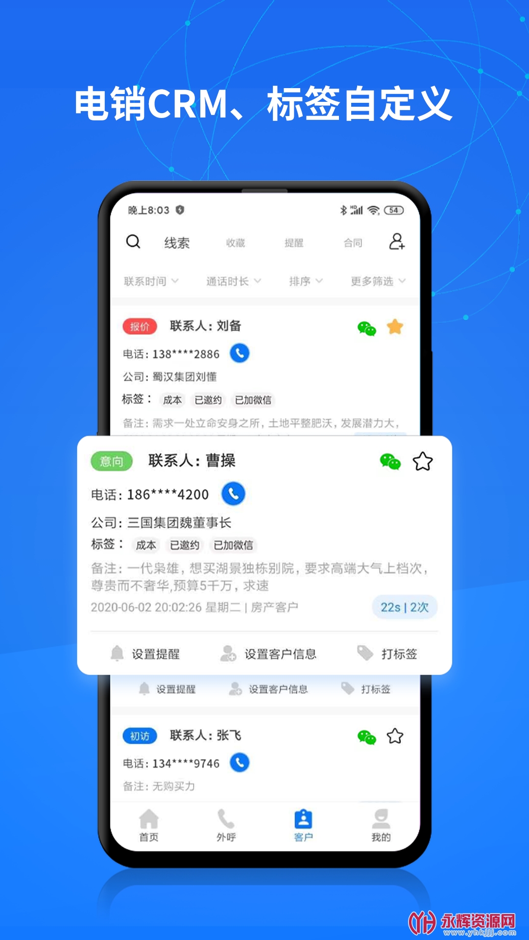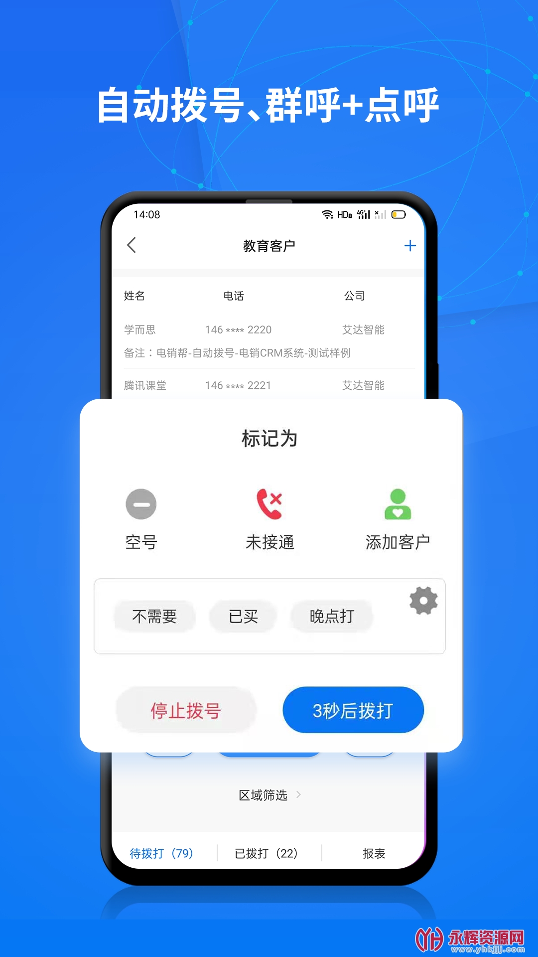 1、呼叫功能:自动拨号,自动外呼,电话软件,电销神器,电销管家,移动销售,电话销售