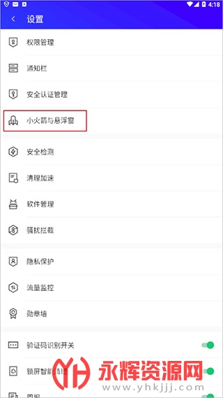 2、设置包括权限管理、通知栏、安全认证管理、小火箭与悬浮窗等,点击小火箭与悬浮窗;