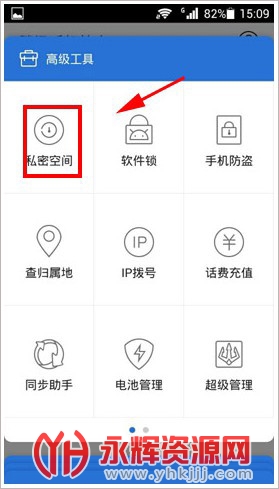 1、进入手机管家【高级工具】栏,选择【私密空间】;