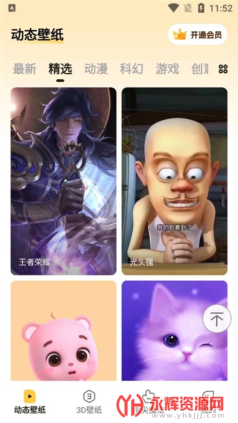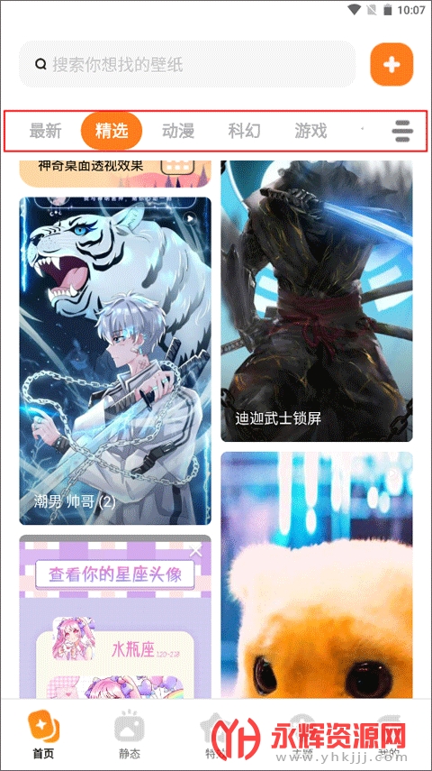 1、打开app并进入主界面【首页】,在这里你会看到不同类型的壁纸资源,如动漫、科幻、游戏、风景等,选择你要设置的壁纸。