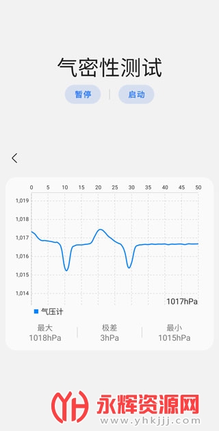 新功能:气密性检测(从主页或者关于手机右上角的按钮进入),可以手动暂停、启动,方便截图,自动计算极差、显示最大、最小值