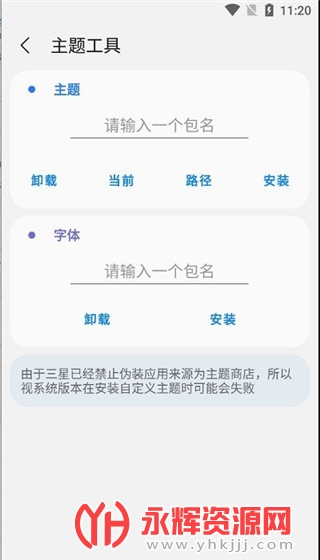 6、OneUI 会通过检查 apk 安装来源:使得修改后的主题字体无法被应用,本应用可以修改安装来源为主题商店或应用商店,使修改后的主题或字体也能被应用和识别(由于 OneUI 的版本更新, OneUI3.及以上已经无法安装修改后的的主题了)