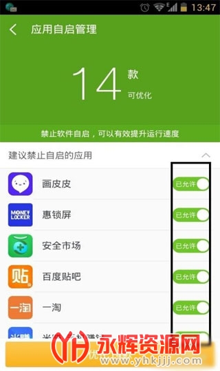 然后就会显示所有已经默认后台自启动的软件。可以看到这里有14款软件开机自启动,手机卡顿在所难免!