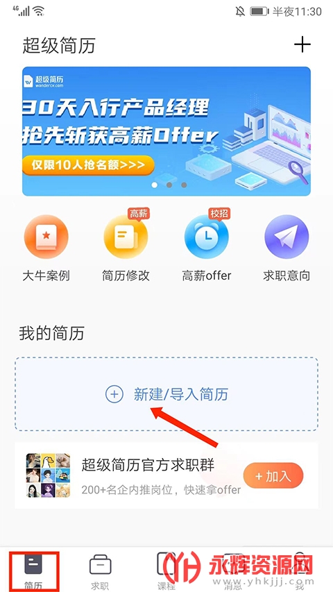 1、打开超级简历,进入应用主界面,选择【新建/导入简历】选项,