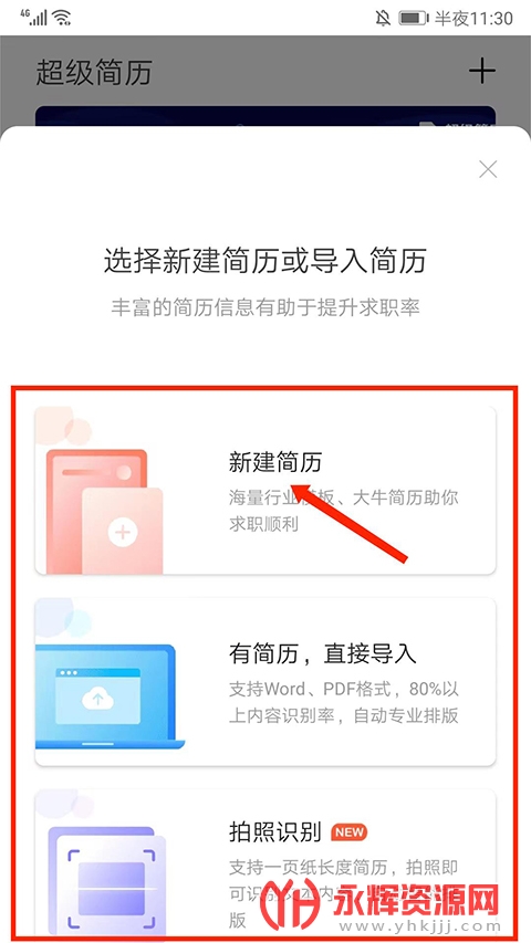 2、包括新建简历、有简历,直接导入和拍照识别选项,选择【新建简历】,