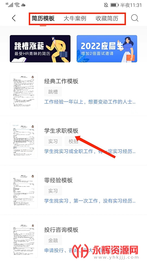 3、进入简历模版选择界面,包括简历模版、大牛案例和收藏简历,用户可根据需求进行选择,这里以为【学生求职模版】为例,