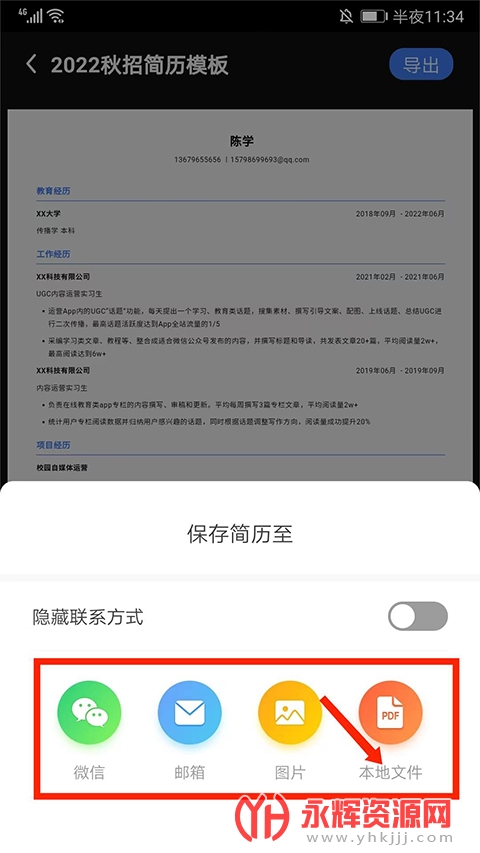 7、支持导出到微信、邮箱、图片和本地pdf,选择【本地pdf文件】选项即可,以上就是超级简历免费导出pdf、生成pdf的方法了。