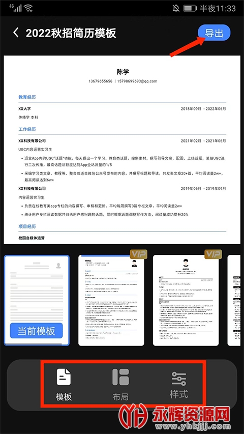 6、进入简历预览界面,选择好相应的模版、布局和样式后,选择右上角【导出】选项,