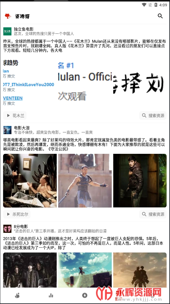 资源猫是一款提供电影、电视剧、综艺、动漫等各类视频资源下载的手机应用。用户可以通过搜索关键字或者浏览分类来找到自己想要的资源,并支持高速下载和离线观看,资源猫还提供了强大的播放器功能,支持多种视频格式和在线播放,让用户无需担心兼容性问题,对于爱好观影的用户来说,资源猫是一款必备的手机应用。