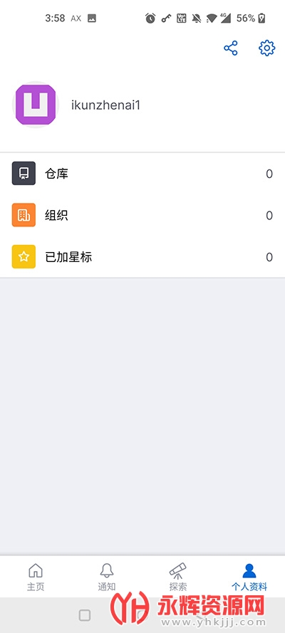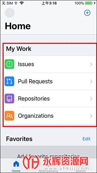 5、登陆成功后,将会出现个人的github手机版主页,可以对Repository(代码库),pull request(代码审查),Issue(问题),Organization(组织)等进行操作和管理