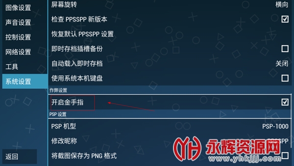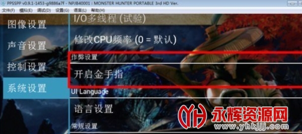 1、这里以怪物猎人p3和ppsspp模拟器为例,首先打开模拟器,在“游戏设置”——“系统设置 ”——“开启金手指选项 ”。
