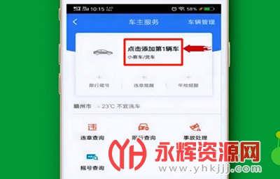 5、进入到车主服务页面,点击“点击添加第1辆车”。