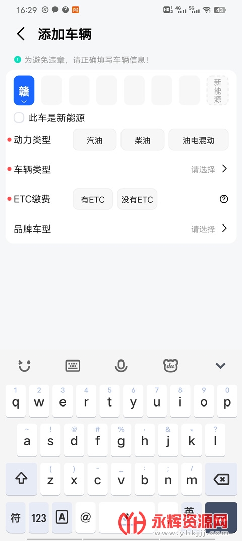 2、输入车牌号,汽车类型,品牌,有无etc等信息,点击完成;