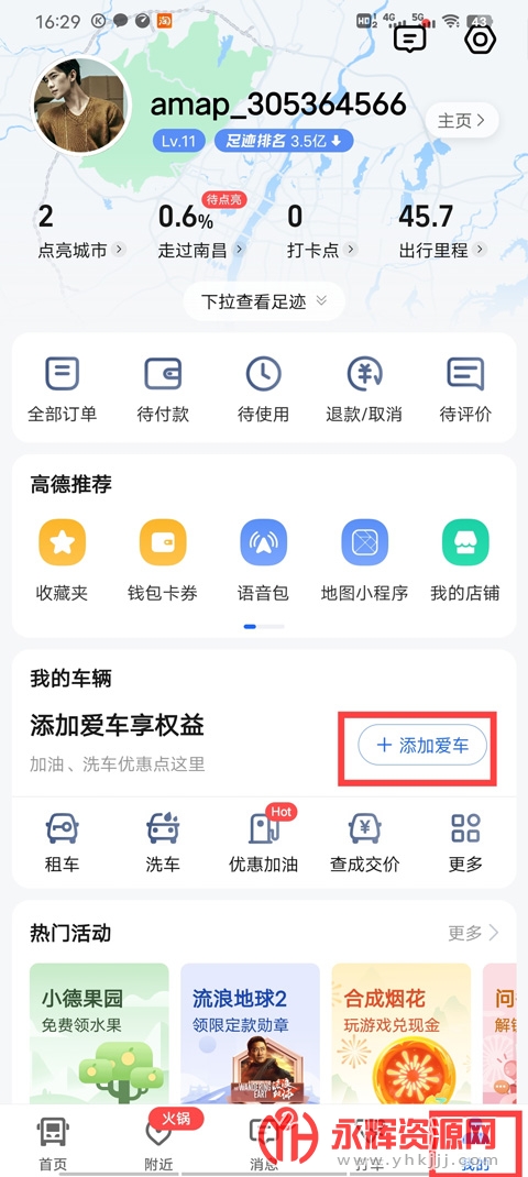 4、登录完成后进入到个人页面,点击“添加爱车”。