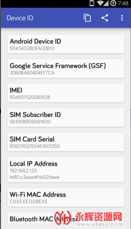 Device ID是一款移动端设备信息工具软件。该软件可以帮助你查看设备信息,ID,本地IP,Mac地址和序列等等,功能十分强大,不仅如此,Device ID还可以让你轻松复制和分享这些设备信息。同时,Device ID对于其他开发商来说,是得到到用户与客户双重支持的有利道具。