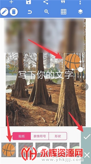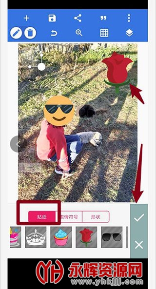 5、点击“帖纸”,选择您想要加入的帖纸,放置合适的位置和调节大小,点√号保存,显得更漂亮。