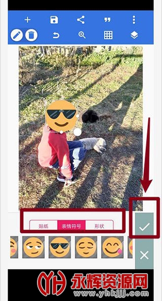 4、点击“表情”,选择您想要加入的表情,放置合适的位置,点√号保存,显得更有趣。
