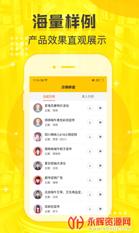 3、海量配音样例提供参考,产品效果直观展示,喜欢那款随意使用,都免费的。