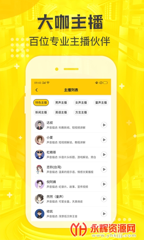 1、平台上的配音有很多的大咖主播都在玩,百位专业主播伙伴一起分享;