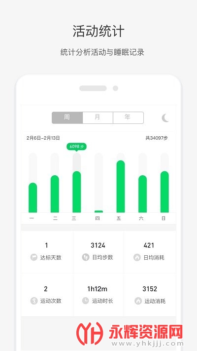 详尽的数据图表,让你了解每周每月的运动睡眠准据,调整目标计划。