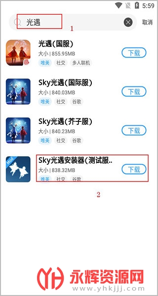 2、在上面搜索“光遇”,下面就会出现各种渠道服,用户就可以下载测试服啦;