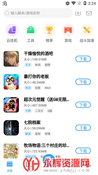一共分为云挂机、工具、榜单、游戏、战斗加速插件等五个大分类,为用户提供实用的资源分享