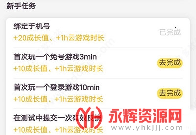 2、新手任务:完成里面的新手任务也可以获得时间增加,通过绑定手机号以及试玩云游戏的方式可以在里面增加相应的时间;