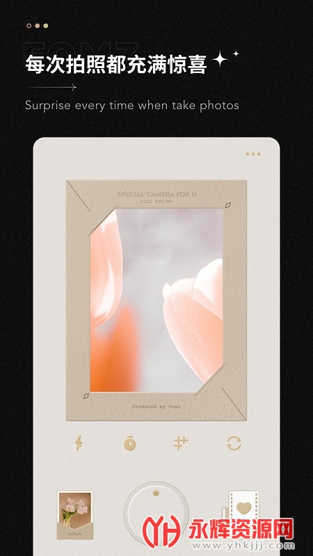 精选多款经典胶片滤镜,每个主题都根据风格搭配好不同的胶片颗粒、时间水印、漏光特效与胶片相纸等等的成像效果,让你每次拍照都充满惊喜;