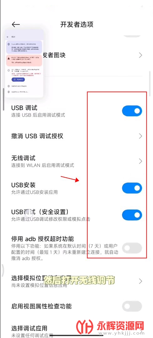 4、在选项当中将下图中的开关设置成如图一样,然后点击无线调试。