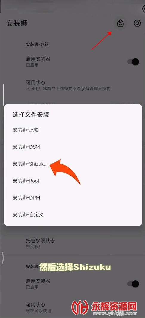 9、打开安装狮,点击右上角的安装,选择安装狮-Shizuku。