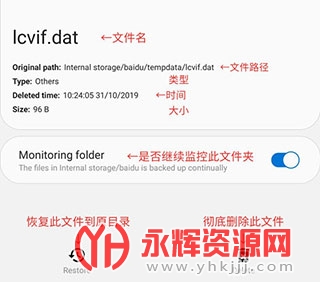 效果很像PC上的回收站功能,通过在后台持续全局监控手机存储变化,当有文件被删除,等情况时,将文件移到文件卫士里面统一管理。