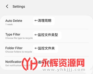 在设置里可以调整文件卫士自身清理周期,监控的文件类型,监控的文件夹,通知栏是否显示通知。