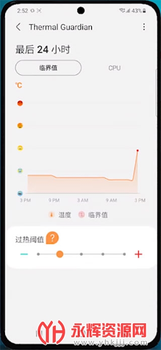可以通过操作热阈值滑块让手机保持合适的温度。同时也可以点击温度表上的指示点,查看手机为什么会变热。