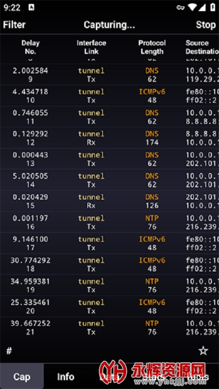 1、捕获网络数据包:WiCap可以实时捕获Android设备上的网络数据包。它可以监听设备的网络接口,捕获进出设备的数据流量。