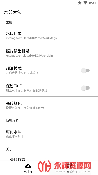 自定义水印功能只需要把水印图片放入对应的目录(目录可以在设置界面设置)即可使用,也可以从右上角菜单进行导入。
