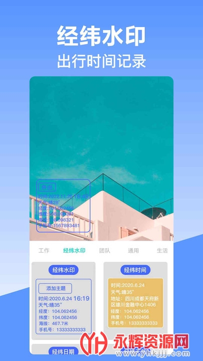 经纬时间相机是一款手机软件,能够记录下珍贵时刻并展示不同时空的奇妙对比。用户可以选择任意一个时间点进行拍摄,仿佛穿越到了那个时刻。此外,软件还具有即时地定位功能,用户可以在app内选择不同的地点进行拍摄,身临其境地感受各个景点和拍照的魅力所在。经纬时间相机能够帮助我们记录照片的拍摄时间和地点,使照片更加有意义、有故事。如果您对这款软件感兴趣的话,不妨来永辉资源网下载体验一番吧!
