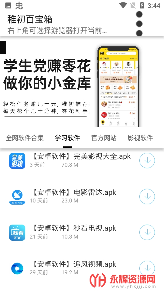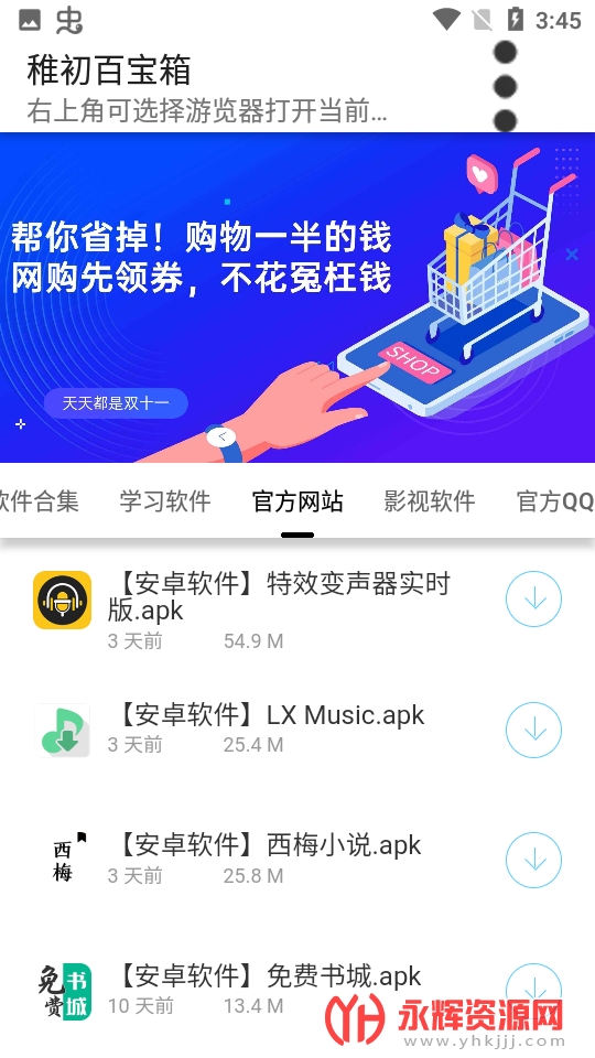 稚初百宝箱是一款功能强大且非常好用的移动端手机辅助工具软件。它具有干净简单的界面,内置了海量的软件资源,包括免费影视、小说漫画APP、破解游戏资源等。用户可以根据需要选择和下载任何游戏和应用程序,全程无限制且免费使用。此外,稚初百宝箱还提供了众多精品的下载资源,包含各种不同的软件和游戏等资源,并提供各种不同的游戏辅助工具,每天更新不断。用户可以直接搜索满足自己需求的内容。如果您对这款软件感兴趣的话就来永辉资源网下载体验一番吧!