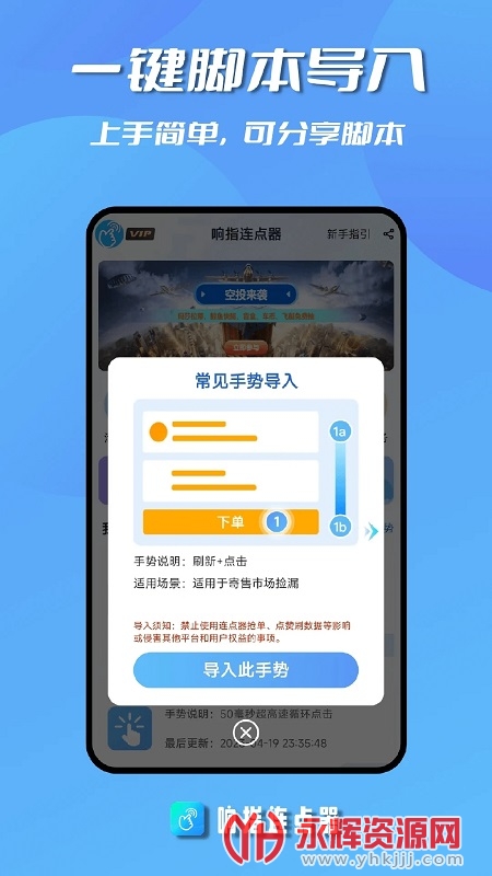 3、一键脚本导入:用户可以轻松导入脚本,实现自动点击,简化操作流程。