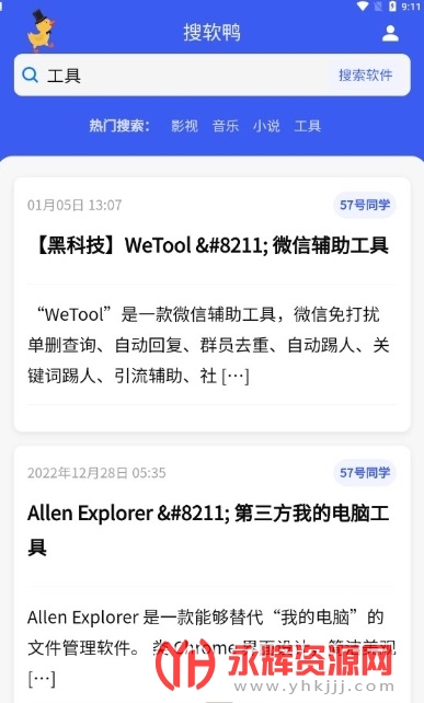 搜软鸭app是一款非常优秀的资源搜索库,内含丰富的软件资源,涵盖了各种影视、游戏、小说、动漫、系统工具等类型。用户可以在这款应用中轻松找到自己感兴趣的软件和资源。搜软鸭app提供了多种类型工具供用户挑选,并且一键下载安装,操作简便,全部免费。总之,搜软鸭app是一款值得尝试的资源搜索库。