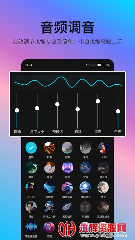 音编美声是一款专为音乐爱好者和专业音频制作人设计的全能软件。它集成了丰富多样的音频处理工具,如均衡器、压缩器、降噪器、混响等,以帮助用户轻松调整音频的音质、动态范围和空间感,创造出更加清晰、自然的声音效果。此外,软件还支持多种音频格式转换,如MP3、WAV、AAC等,满足用户不同的需求。如果您对这款软件感兴趣的话,不妨来永辉资源网下载体验一番吧!